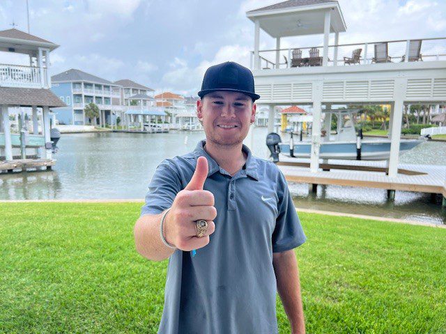 While spending time at a friend’s family home in Galveston, Caden was sitting on a second-story dock overlooking the bay. As he moved his hand, his Texas A&M class ring suddenly slipped from his finger and disappeared into the water below—roughly ten inches deep.